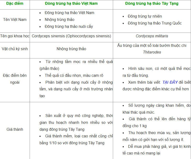 Chính vì sự khác nhau này mà đông trùng hạ thảo Việt Nam hay các loại đông trùng hạ thảo nuôi cấy khác và đông trùng hạ thảo Tây Tạng là 2 loài hoàn toàn khác nhau, tương ứng với ký chủ khác nhau. Do đó cho đặc điểm về hình dạng, thành phần hoạt chất, giá trị dinh dưỡng sẽ có những điểm khác nhau.